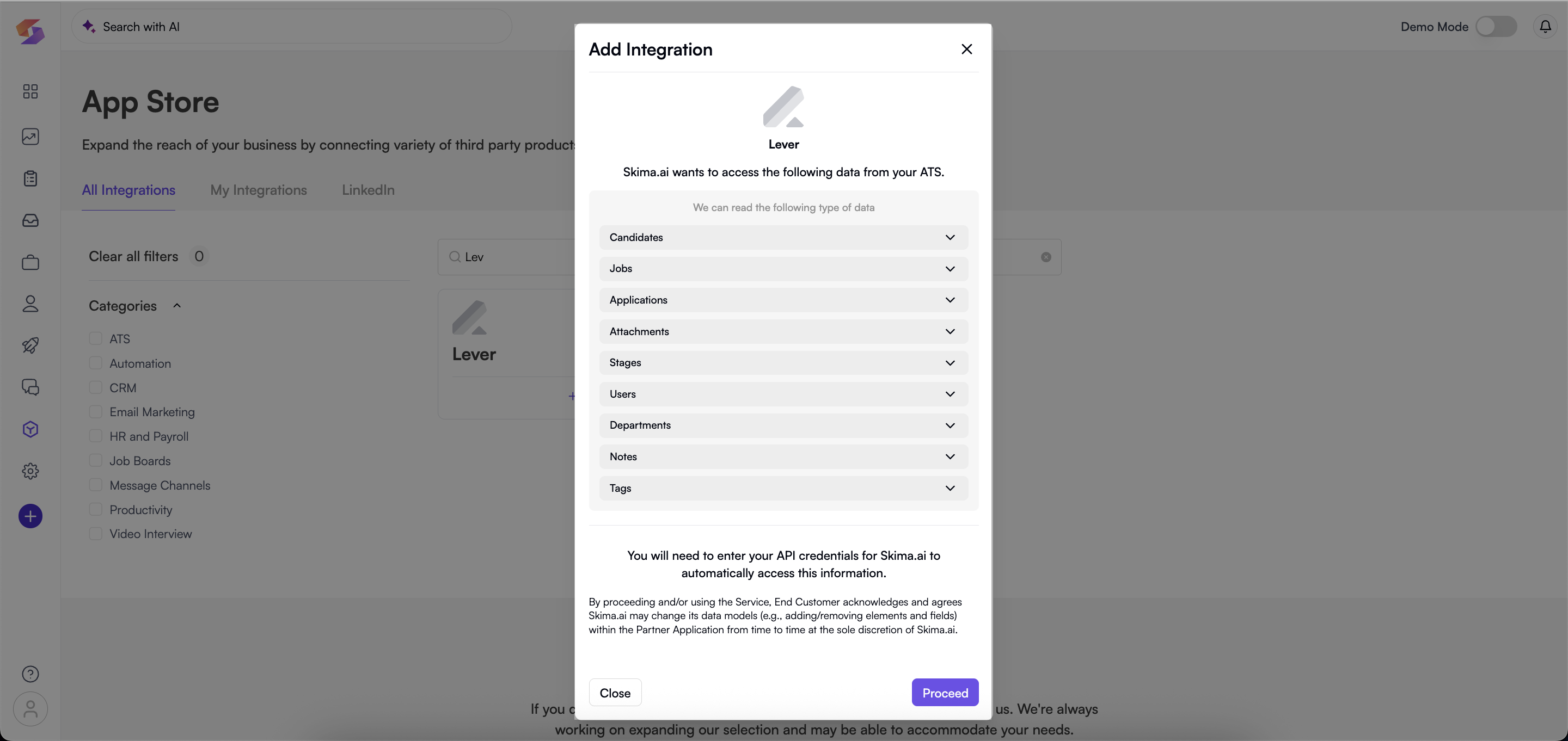 Review the permissions Skima AI requires data types it will read from Lever, such as: i) Candidates