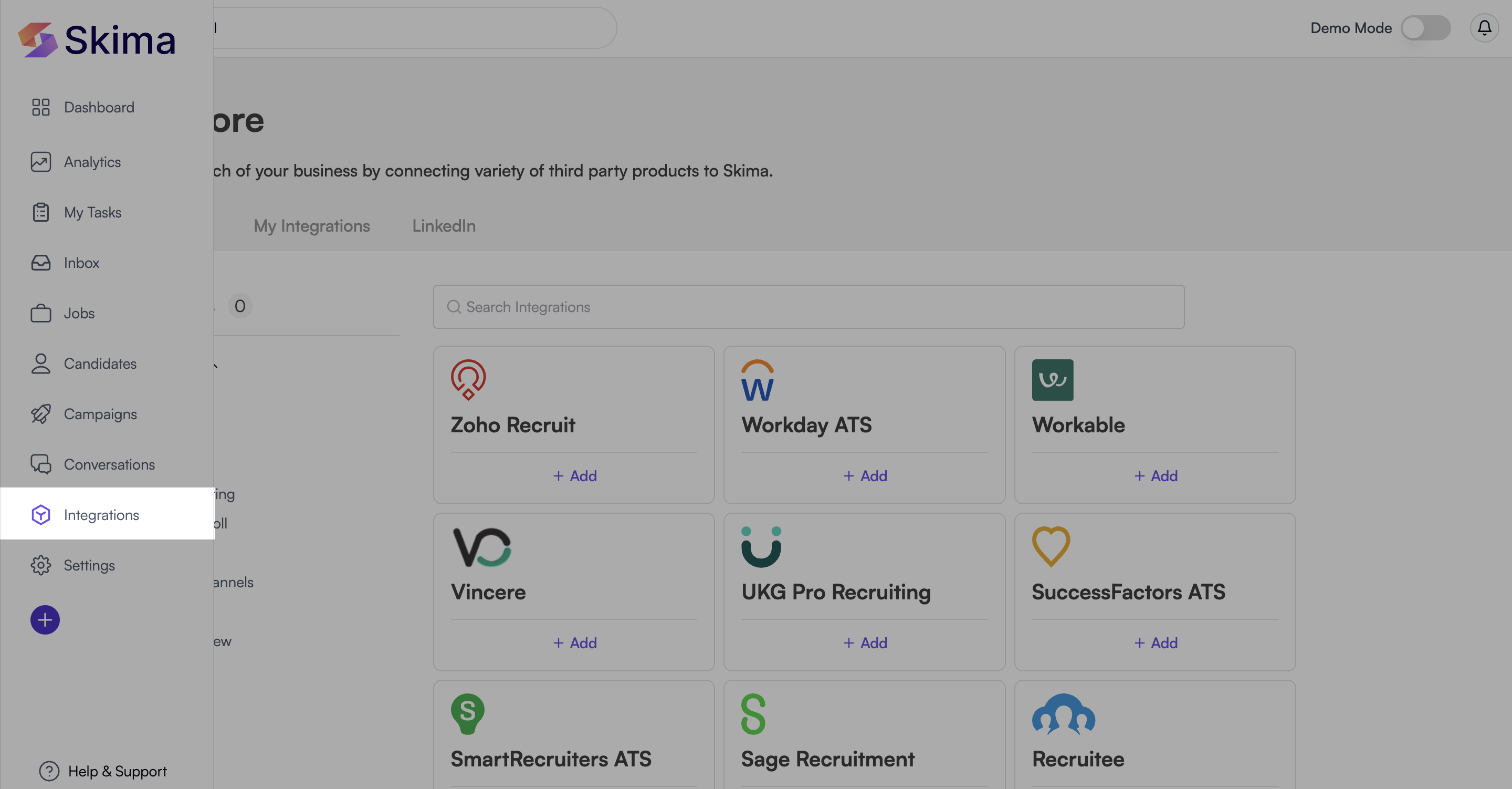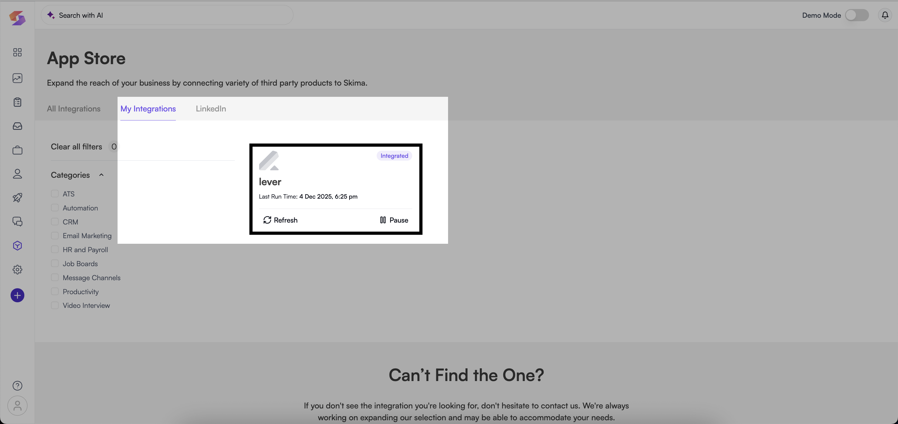 After successful authorization, Lever will appear under your My Integrations tab in Skima AI, showing that the integration is now active and syncing.