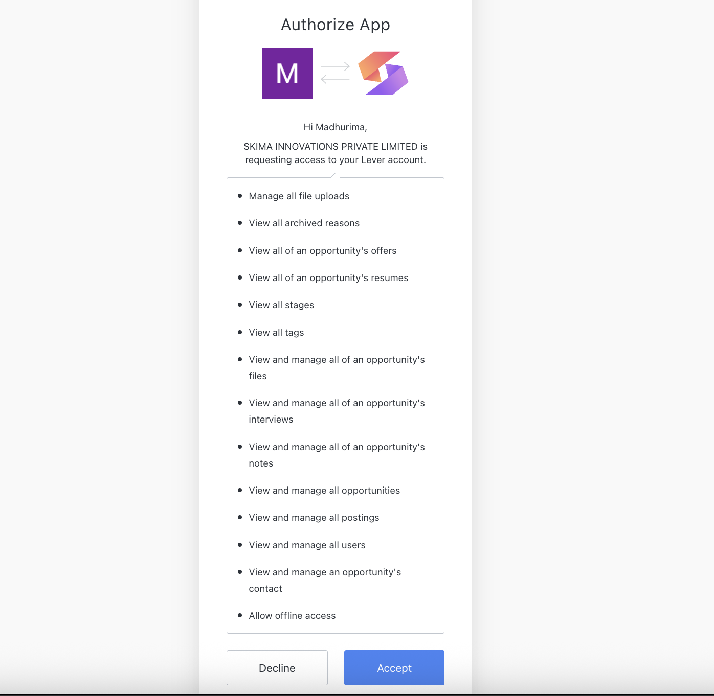 Once the credentials are submitted, you will be redirected to Lever's authorization screen, where you must approve Skima AI’s access. Click Accept to authorize.